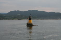 フェリーは宇品港を出港し、似島の安芸小冨士、峠島を見ながら江田島市切串へ。ちょうど潮が引ききった時で、牡蠣の養殖筏に垂下するための牡蠣採苗棚が海面から姿を現し、真夏の陽射しを浴びていた。