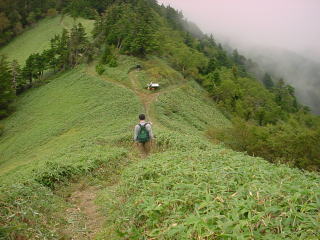 山頂には雲がかかって展望が失われていた。登りルートは急峻だったが、山頂は平坦な中に木道で渡っていったところにある。朝8時に大阪を出て、午後4時に山頂に到達した。
